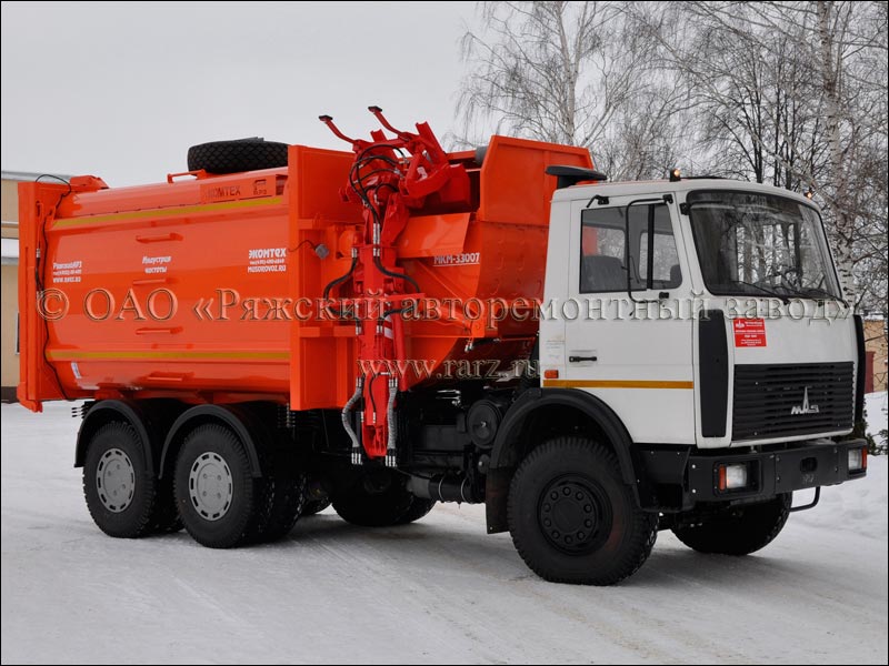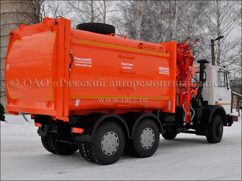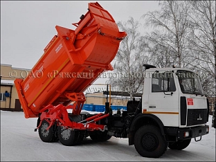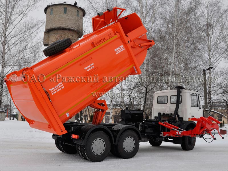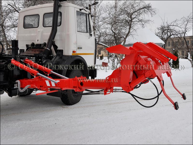 Мусоровоз оборудован унифицированным манипулятором высокой прочности.